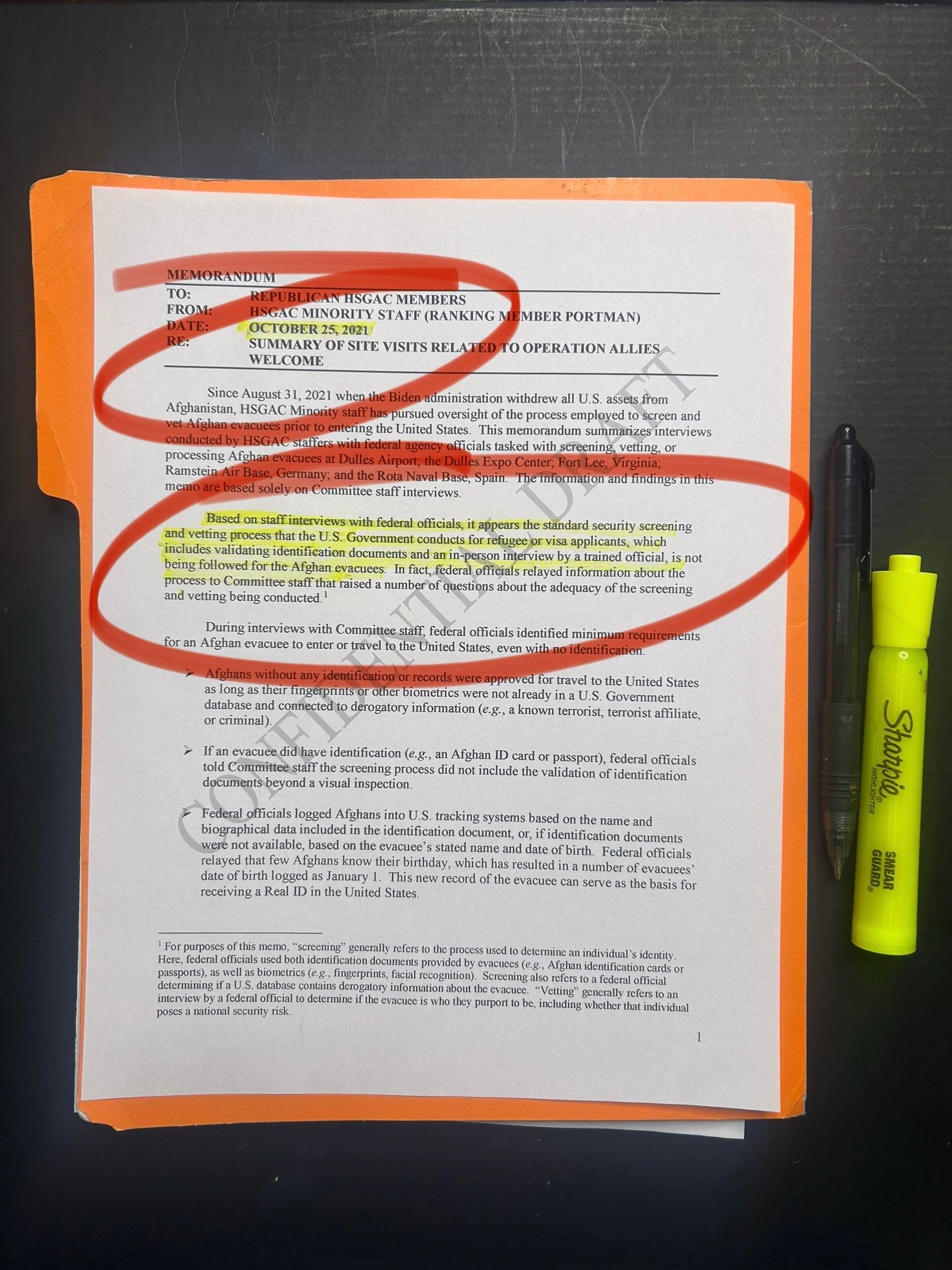 October 2021 Report From Then-Senator Rob Portman’s Staff Documenting Security Gaps In Afghan Vetting Process